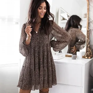 Women Fashion Casual Leopard Printed Lantern Sleeve V-Neck Large Swing Dress